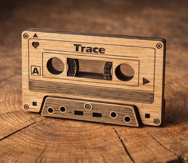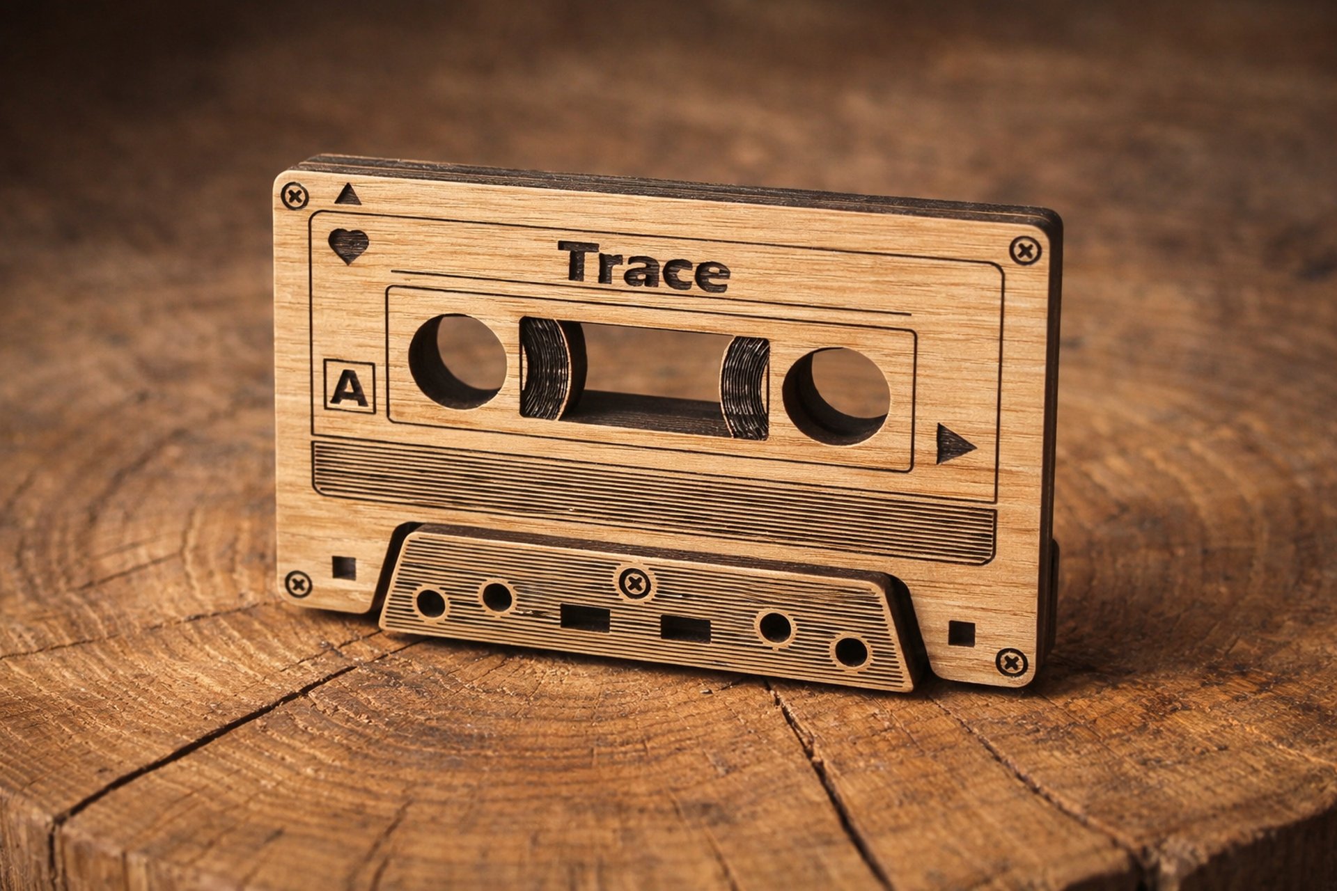 Un objet en bois sert de support élégant et naturel pour votre souvenir, avec un QR code intégré à scanner.
